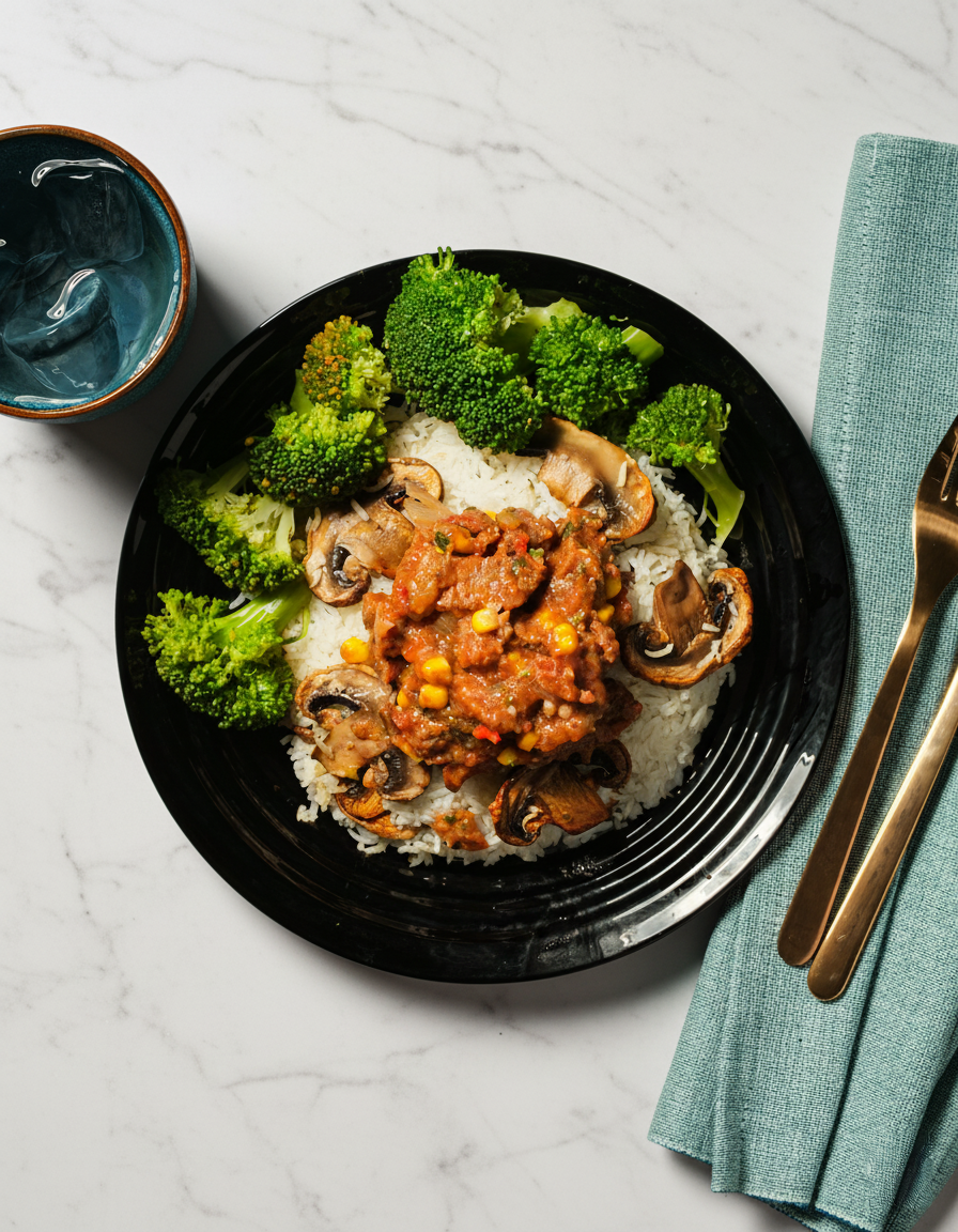 Ainesosat: Naudanliha, parsakaali, tomaattipelati, herkkusieni, basmatiriisi, sipuli, maissi, voi, soijakastike, korianteri, chili, oliiviöljy, suola, mustapippuri.