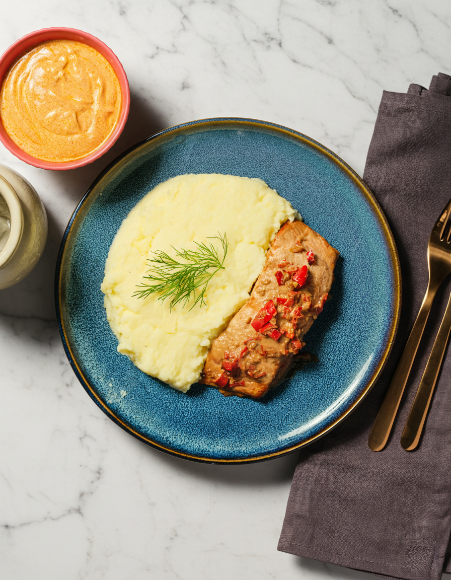 Thaimarinoitu lohi paprikakastikkeella ja kermaisella muusilla