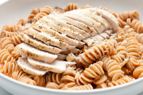 Kana, suola, mustapippuri, valkosipulijauhe, kuivattu basilika, sitruuna, oliiviöljy, fusilli-pasta, oregano, punainen paprika, kesäkurpitsa, herkkusieni, kirsikkatomaatti, tomaattimurska, tomaattipyree, vegaaninen kerma (soija), vesi