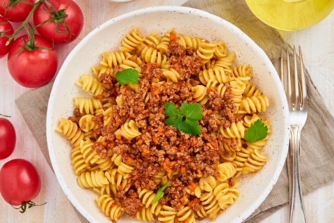 Naudan jauheliha, sipuli, tomaattimurska, tomaattipyree, kuivattu basilika, suola, mustapippuri, oliiviöljy, kirsikkatomaatti, fusilli-pasta, valkosipulijauhe, oregano, paprika, vihreät pavut, babyporkkana