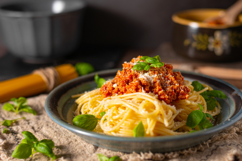 Naudan jauheliha, bolognesekastike, spagetti, oliiviöljy, valkosipulijauhe, suola, mustapippuri, porkkana, herne, juustokumina, Parmesan juustoraaste